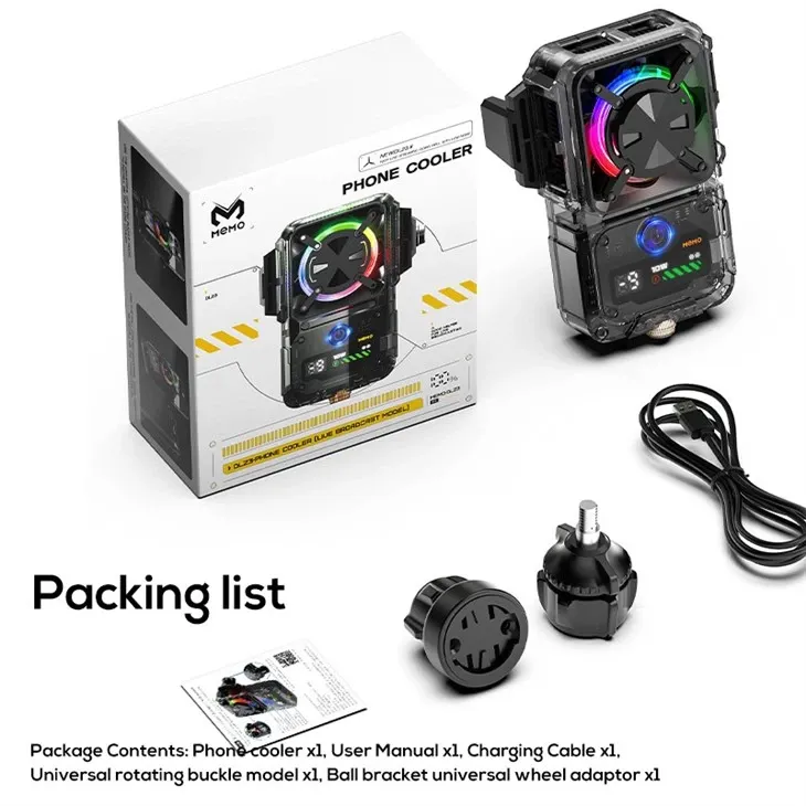 Phone cooler x1, User Manual x1, Charging Cable x1, Universal rotating buckle model x1, Ball brocket universal wheel adaptor x1.